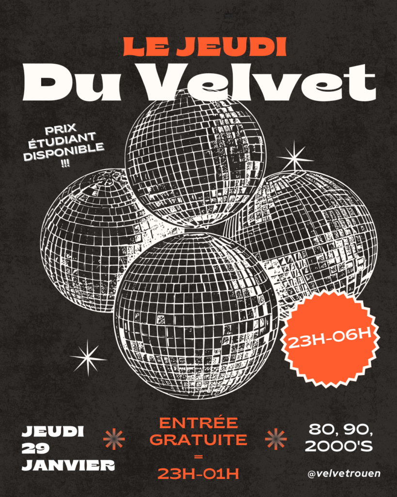 📅29 janvier 2026 23h00 🏛️Velvet 💶15€ entrée + vestiaire + 1 consommation offerte / Entrée gratuite de 23 h à 01h et prix étudiant disponible !😎 📍105 Boulevard de l’Yser, Rouen 76000 🏷️Autre ✉️velvetrouen@gmail.com ☎️0612754028
