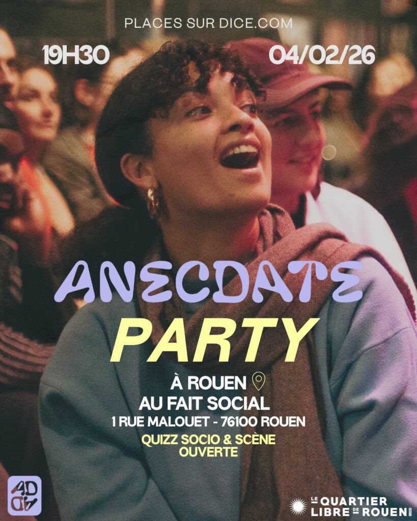 📅4 février 2026 19h30 🏛️Le Fait Social : Établissement intérieur dans le Quartier Libre de Rouen 💶10 euros 📍1 place Carnot, site SNCF Saint Sever Accès par F1 arrêt Champlain ou métro Joffre Mutualité 🏷️ ✉️anecdateparty@gmail.com ☎️0632441564