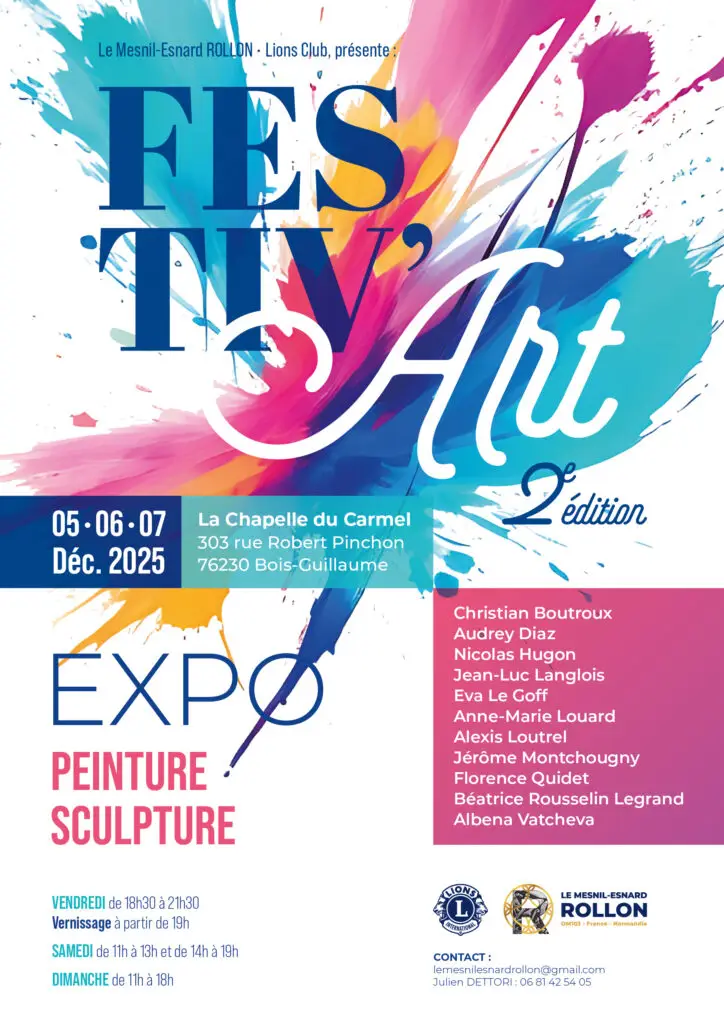 Allier plaisir des yeux et générosité, c’est ce que vous propose le lions club lors de son exposition « Festiv’Art » du 5 au 7 décembre à la chapelle du Carmel de Bois-Guillaume. Des peintures et des sculptures pour tous les goûts dont le profit des ventes ira à la lutte contre le cancer infantile. Un tirage au sort sera organisé avec la possibilité de gagner l’œuvre d’un de nos artistes. Pour cette seconde édition, un jeu de piste pédagogique sera proposé au public scolaire.