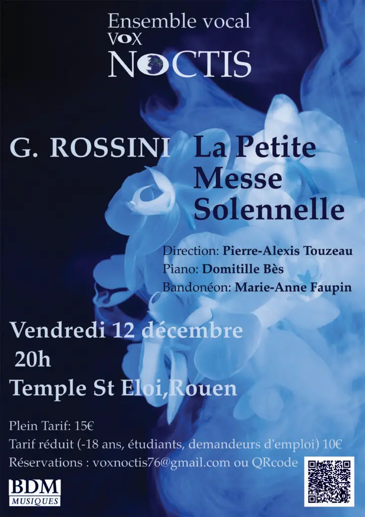 Vous les avez découverts lors des spectacles Luminiscence à la cathédrale de Rouen : les chanteurs de l’ensemble vocal professionnel normand Vox Noctis vous proposent un premier événement musical avec la Petite Messe Solennelle de Rossini, dans sa version à 12 chanteurs accompagnés de Domitille Bès au piano et de Marie-Anne Faupin au bandonéon, tous placés sous la baguette de Pierre-Alexis Touzeau.