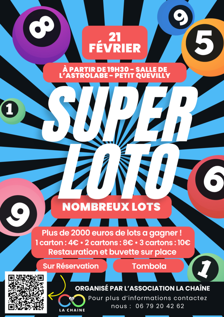 Loto annuel 📅21 février 2026 19h30 🏛️Astrolabe 💶10 📍le petit quevilly 🏷️Autre • Sport ☎️0768740244 Loto le 21 février de l’association la Chaîne.