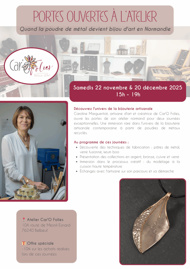 Caroline Margueritat, artisane d’art et créatrice de Car’O Folies, ouvre les portes de son atelier normand pour deux journées exceptionnelles. Une immersion rare dans l’univers de la bijouterie artisanale contemporaine à partir de poudres de métaux recyclés.