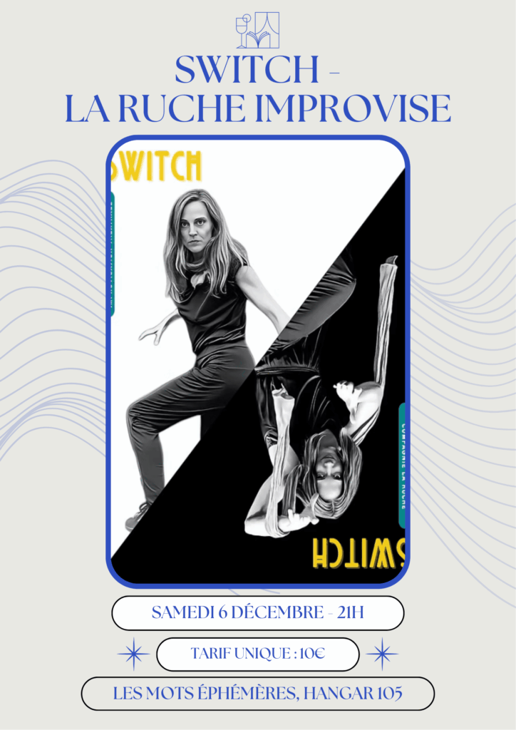 Le samedi 6 novembre dès 21H, nous retrouvons avec joie SWITCH, le spectacle d’improvisation signé la Cie La Ruche, déjà venu à plusieurs reprises aux Mots Éphémères. À chaque fois, c’est une nouvelle histoire qui prend vie, entièrement improvisée à partir des éléments tirés au hasard et des choix du public. L’héroïne de la soirée, tirée d’un jeu de cartes d’archétypes, verra son destin basculer… mais dans quel sens ? À vous de décider. Portée par deux comédiennes à l’imagination foisonnante, cette performance est aussi drôle que surprenante et surtout, toujours différente !